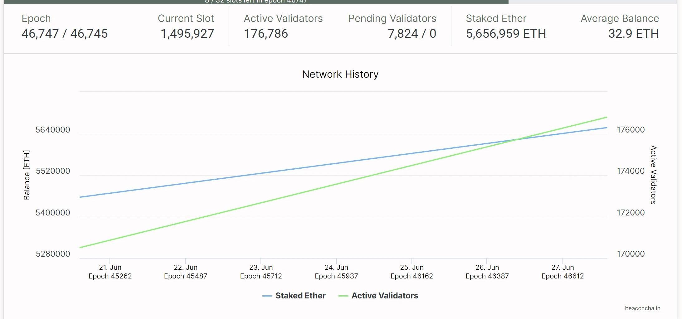 XRP/HKD-0.81%截止6月27日,以太坊2.0合約地址的質押數量即將達到600萬枚ETH,這對于以太坊來說是一個量的突破。