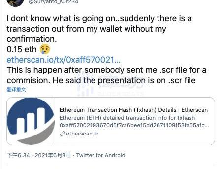 令人擔憂的事情終究還是發生了。6月8日,加密藝術家Suryanto發布了一條推特:「我不知道發生了什么事……我的錢包突然有一筆未經我確認的交易被發送了出去。」這筆交易讓Suryanto損失了0.15ETH,而在這一筆錢的背后,這件事情對于藝術家來說是一場浩劫。而一切的起因卻是因為他打開了一個人發來的「.scr」后綴的文件。