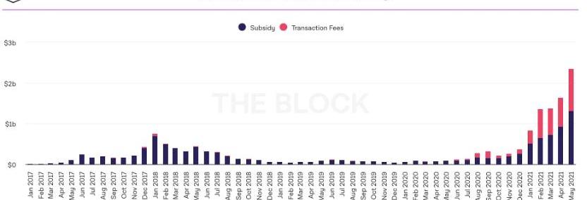 XRP/HKD-5.33%作者:茉莉;編輯:文刀動蕩的5月結束了,比特幣和以太坊均未收回距離高點的跌幅。當比特幣的中國礦工們還在焦慮中等待監管出清礦場的政策時,用顯卡挖礦的以太坊礦工迎來了「漲薪」。TheBlock數據披露,以太坊礦工群體的總收入在5月創下新紀錄,達23.5億美元,其中,鏈上交易為礦工們貢獻了10.3億美元的手續費收入,占總收入的43.8%。從歷史統計數據看,礦工的鏈上交易費收入從去年8月開始有了明顯的增加,在今年2月一度超過了區塊獎勵收入。交易費用的增加與以太坊鏈上DeFi生態規模擴張的趨勢強相關。盡管ETH價格在5月出現了腰斬行情,但礦工的ETH收入反而在增加。特別是5月19日大跌當天,ETH日跌幅26%,而全網礦工的ETH挖礦獎勵和手續費達74502ETH,創下月內最高記錄。當日,資產市場高波動,鏈上DeFi用戶的避險行為頻繁,貢獻了大量的網絡費用。最近一年,以太坊帶給礦工的網絡手續費收入逐漸趨近于挖礦獎勵收入,有兩個月,手續費反超挖礦獎勵。讓手續費成為ETH的價值捕獲方式之一,正是以太坊轉型方向的題中之意。5·19大跌日以太坊礦工賺翻