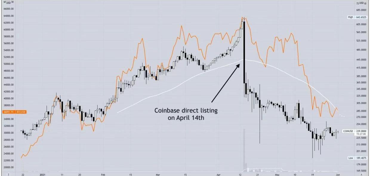 圖10比特幣價格和灰度的比特幣持有量以及現貨市場價格的溢價在2021年第一季度,很多市場參與者都在關注Coinbase的直接上市。比特幣價格和COIN價格在這一事件之前的幾個月里都在攀升,并在2021年4月14日直接上市時達到其歷史高點。在直接上市的同時,Coinbase的高管們也施加了巨大的拋售壓力,他們出售部分頭寸,導致其股價大幅下跌。