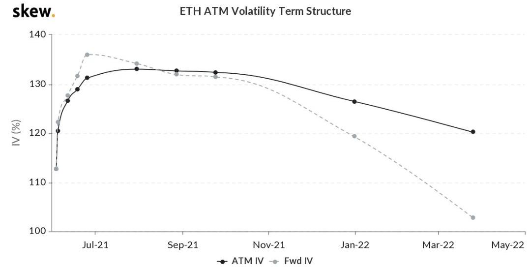 播報數據由Greeks.live和Skew.com提供。昨日比特幣大宗交易占比30%,今天大宗交易占比25%,以太坊也有14%的成交是看漲期權大宗交易,連續兩天如此高的大宗占比是不同尋常的。而且近期的大宗成交非常集中,時間和價位如此集中的大宗成交,很有可能是組織有計劃的交易。期權成交量5.47億美元,期權持倉量為58億美元。10d104%30d117%90d86%1Y73%各標準化期限隱含波動率:今日:1m90%,3m95%,6m98%,DVol102%6/2:1m95%,3m98%,6m99%,DVol108%比特幣在當前價位連續橫盤數日,RV下降明顯,中短期IV也同樣進入快速下降趨勢,Skew均回到10%以下,大宗成交的低IV明顯的拉低了整體IV。