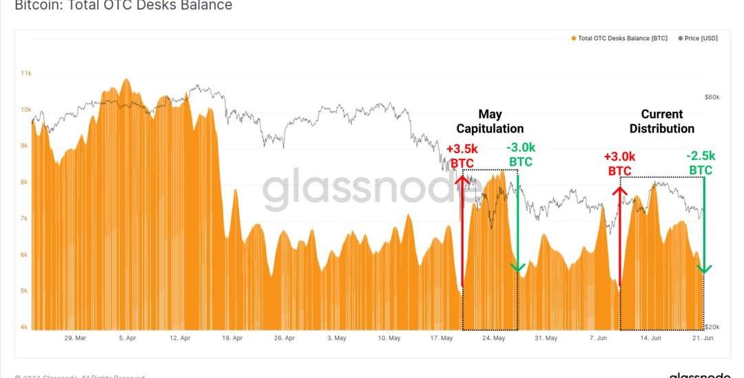 最后,我們看一下場外交易市場的持有量,這些場外交易市場被礦工用來匹配大批量的買家和他們的大規模供應。在5月拋售期間和過去兩周,觀測到有3.0萬至3.5萬個比特幣的凈流入。然而,在這兩種情況下,幾乎所有的流入規模都在短短幾周內被買家吸納了。總的來說,自4月以來,我們監測的場外交易市場柜臺上的比特幣總持有量一直保持相對的平穩。