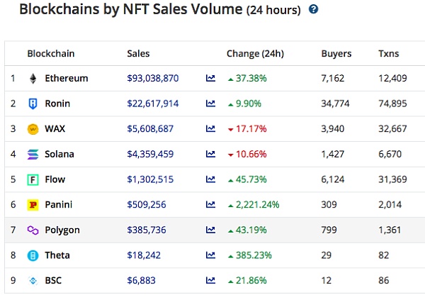 從交易情況看,來源于Crypto Slam的24小時交易排名圖表,我們看到除以太坊外,Solana、Polygon、WAX、Ronin、Fantom出現頻率較多,而從公鏈的NFT24小時交易排名看,因游戲爆火的Ronin和WAX排名二、三位,Solanna緊隨其后。種種數據說明,雖然各項目的角逐點不同或開啟的時間不同,但這并不影響公鏈在NFT上百花競艷,可以說,此時的NFT市場早已不再是以太坊的獨角戲。