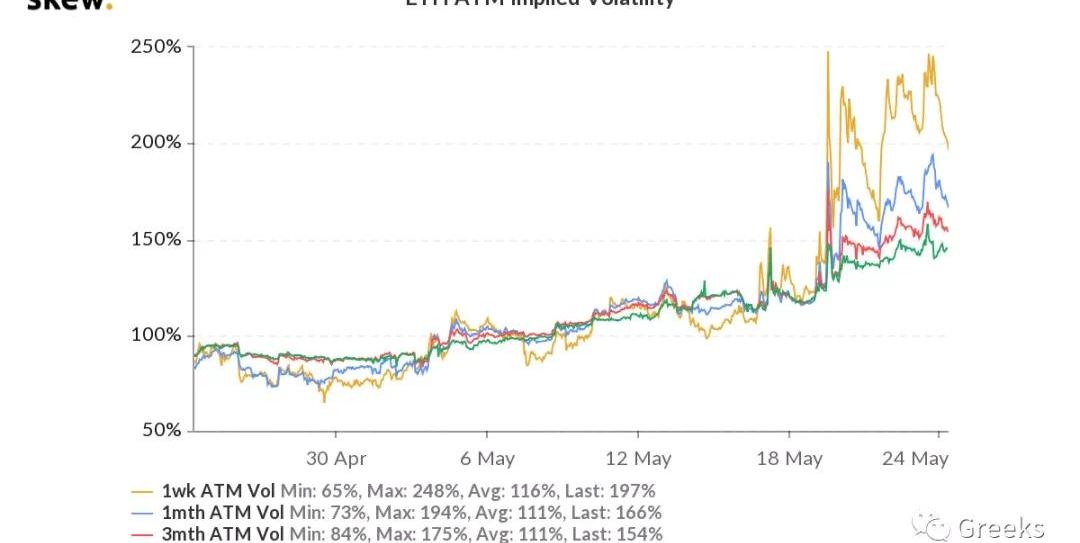 以太坊期權成交量3.41億美元,持倉量33億美元。10d257%30d178%90d127%1Y100%各標準化期限IV:今日:1m167%,3m154%,6m145%5/23:1m181%,3m162%,6m149%以太坊昨天2000美元破的很直接,一度守不住1800美元。以太坊并未守住2000美元的關鍵點位,今天雖然反彈但力量有限,因為擊破關鍵點位這種走勢總是讓人擔心。IV下降明顯,雖然昨日行情很大,但是基本屬于兌現前期壓力,現在的IV水平仍然是比較高的。
