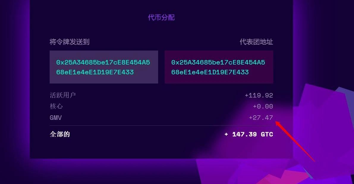 目前在社群中,曬出獲得最多空投的大戶地址領到了98566個GTC,按照單價3.7美元計算,合計36.5萬美元,疑似項目開發者。