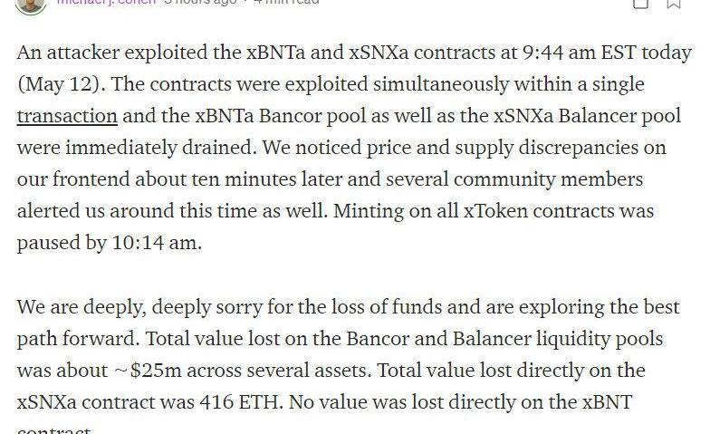 美國東部標準時間5月12日上午9:44分,鏈必安-區塊鏈安全態勢感知平臺監測顯示,DeFi質押和流動性策略平臺xToken遭到攻擊,xBNTaBancor池以及xSNXaBalancer池立即被耗盡。據統計,此次xToken被黑事件造成約2500萬美元的損失。盡管在事件后,xToken團隊第一時間發布聲明,并針對被黑原因以及后續補救措施,作出積極回應;但成都鏈安·安全團隊認為此次xToken被黑事件具備相當程度的典型性,涉及到閃電貸攻擊、價格操控等黑客常用攻擊套路,因此立即介入分析,將xToken被黑事件的攻擊流程進行梳理,希望以此為鑒,為廣大DeFi項目方敲響警鐘。