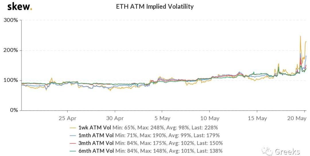 以太坊期權成交量11億美元,持倉量43億美元。10d232%30d165%90d120%1Y100%各標準化期限IV:今日:1m177%,3m151%,6m139%5/19:1m128%,3m127%,6m125%以太坊是這波牛市的龍頭,也是昨天519閃崩的發動機,昨晚一度跌破了2000美元。因為數個DeFi的暴雷,以ETH為基礎的多個項目都遇到了拋售,這直接影響著ETh本身的定價,市場還沒有完全消化。超短期IV爆炸拉升至250%,各主要期限IV也都明顯上升至150%上方。以太坊期權的賣方非常受傷,現在市場需要真金白銀的支撐。
