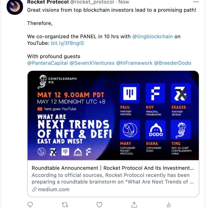 XRP/HKD-2.23%據官方消息,RocketProtocol近日發起了關于《NFT與DeFi的東西方發展之路》的圓桌頭腦風暴,并邀請RocketProtocol媒體合作伙伴CoinTelegraph中文參與協辦。此次圓桌會議將于5月12日12:00pm在YouTube舉行,全球知名投資機構Pantera、FrameworkVentures以及SevenXVentures將受邀參加。此外,RocketProtocol還邀請業務合作伙伴DODO參與此次圓桌討論。會議主持人由CoinTelegraphChina總編Ting擔任。