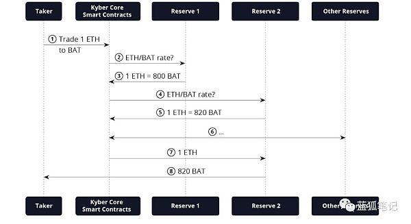 為了讓代幣兌換者有機會獲得好的兌換率,Kyber核心智能合約會向注冊的儲備庫詢問其兌換率,并從中選出最好的兌換率完成交易。也就是,一旦代幣兌換者發送請求后,Kyber協議的智能合約并不是隨機挑選儲備庫完成代幣兌換,而是從不同的儲備庫中進行查詢,比較得出最好的兌換率之后才執行交易。