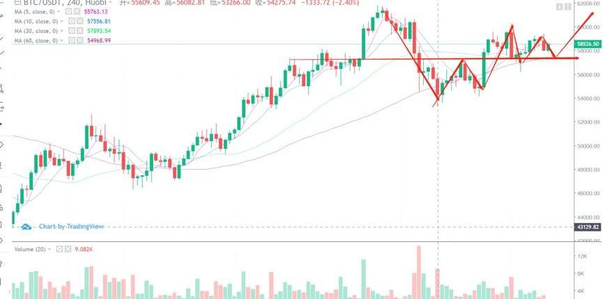 BTC繼續運行在57000的強弱分界線上,形成日線中樞內部的4H周期中樞,4H周期60周期均線是了中樞區間的底部參考支撐點。