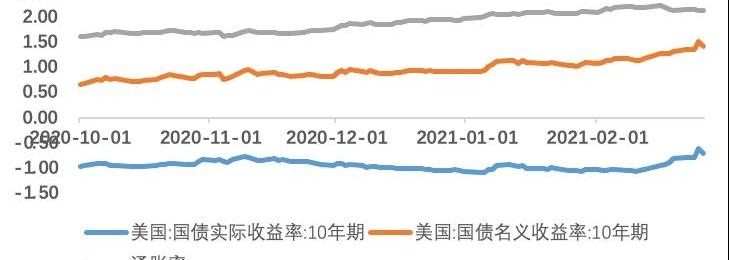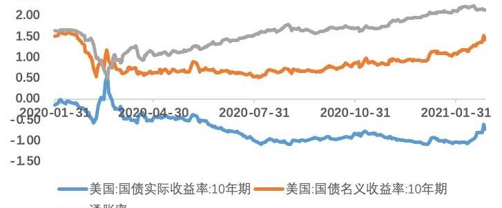 國債市場的收益率已經成為金融市場的基準利率,并成為投資者判斷市場趨勢的風向標,也可以被理解成美元的資金成本。通常情況下,當美聯儲加息,美國十年期國債收益率就會上升,反之,十年期國債收益率就會下降。近期,美聯儲已經處于0利率的狀態,而美債收益率大幅上行,意味著有一定的“先行”效應,反映著市場對于美聯儲量化寬松政策的預期。2020年4月至8月上旬,10Y美債的收益率維持在0.5-0.7%的低水位平穩運行,從8月中旬到1月底,美債收益率開啟上行趨勢。從1月底至今,美國的通脹率保持穩定的趨勢,因此,美債收益率的上漲主要是由實際收益率導致的。如今,美債收益率已超過1.5%,引起金融市場對通脹的擔憂。圖1美債名義、實際收益率和通脹率上升:2020年1月至今