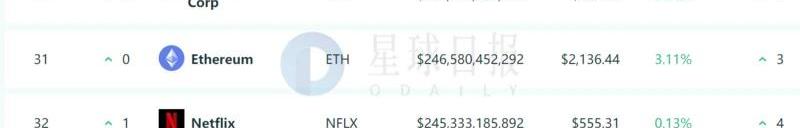 AssetDash數據顯示,隨著ETH價格突破2100美元,ETH市值排名升至全球資產第31位,目前約為2466億美元,已超越網飛。二級市場方面,目前ETH價格短時可能震蕩或小幅回調,支撐位2000美元,阻力位2305美元。二、二級市場