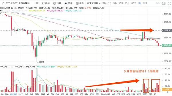 BTC早間沖擊6000美金,隨后就被空頭打壓了下來,下午隨著A股的下跌,跌幅逐漸加大,短時在4800美金徘徊。從盤面看,空頭的下砸量能仍然遠大于多頭的抄底力量,短期的形勢依舊嚴峻,不建議盲目進場抄底博反彈。