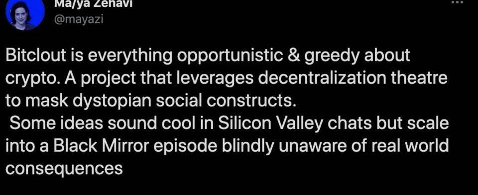 https://twitter.com/HsakaTrades不過,其匿名團隊成員表示,只要BTCLT上架交易所后就可以交易,建于BitClout一眾投資人當中有主流交易所,這意味著上所可交易的可能性很大。此外,BitClout聲稱為了去中心化,采用匿名模式,不過,有人推測其創始人其實是NaderAl-Naji,NaderAl-Naji是BASIS創始人兼首席執行官,此前在谷歌、D.E.Shaw擔任開發工程師。區塊鏈研究人員Lumi認為,BitClout這種激進的經濟激勵模式可能會導致為了獲得財富而詆毀某人名聲的行為,「實際上你只需要先開一個空頭倉,然后設法破壞某人聲譽就可以了。」推特用戶Ma/yaZehavi認為,Bitclout是利用加密項目孕育貪婪和機會主義的溫床。戴著去中心化面具實則是為了掩蓋其反烏托邦社會結構的實質。有些想法看起來很酷,但越想越覺得會發展成為黑鏡某一集中所預言的那樣為現實生活帶來可怕的后果。