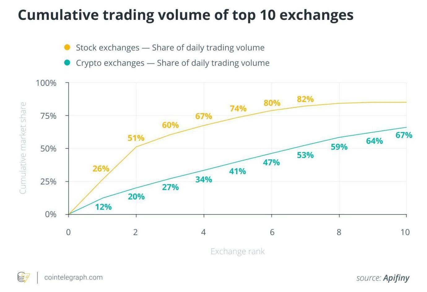 與傳統股票相比,加密貨幣市場是高度分散的。全球最大的兩大股票交易所占全球股票日交易量的51%,而全球三大加密貨幣交易所僅占全球加密貨幣日交易量的27%。缺乏統一的全球交易市場