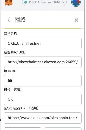 在彈出的表單中輸入下列信息:網絡名稱:OECTestnet新增RPCURL:http://OECtest.okexcn.com:26659/鏈ID:65符號:OKT區塊鏈瀏覽器URL:https://www.oklink.com/OEC-test/