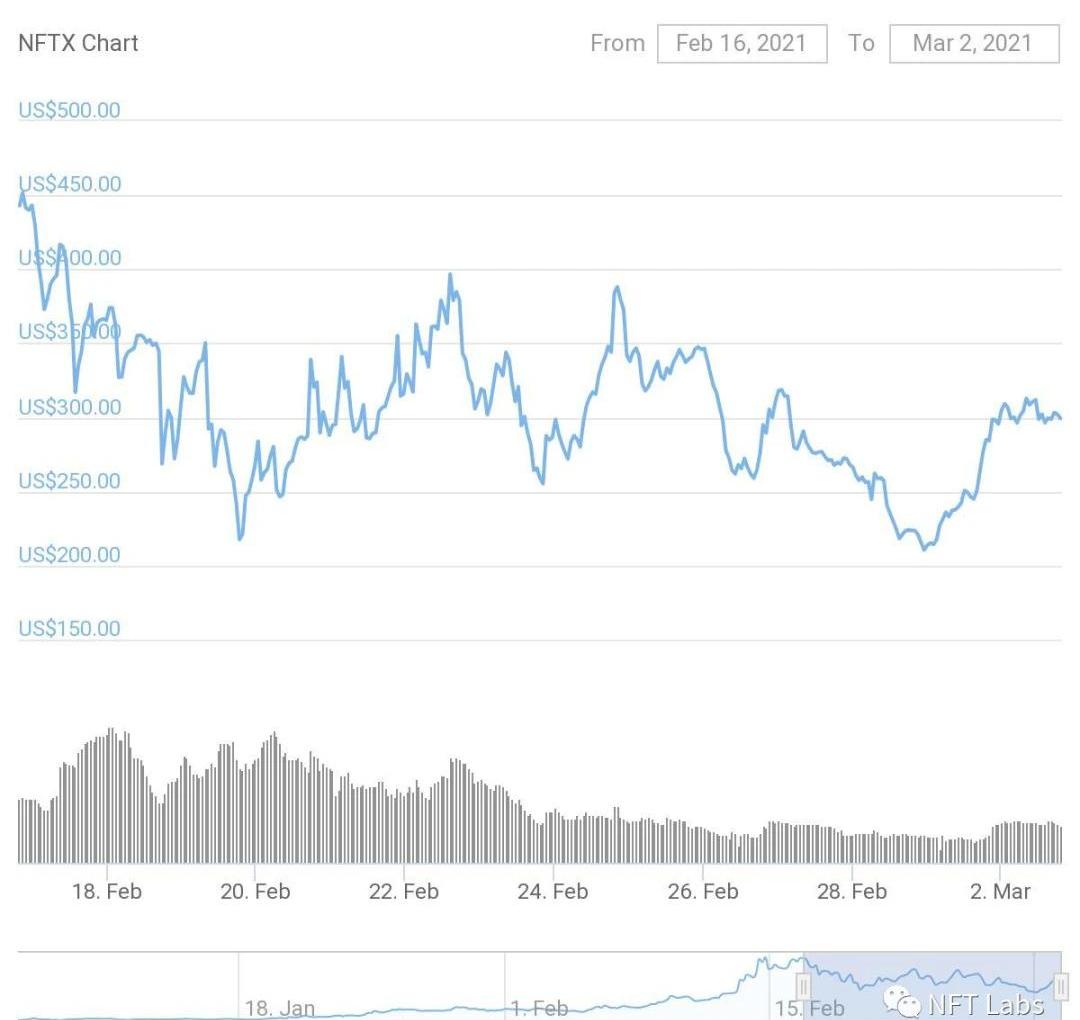 NFTX代幣發行于2021年1月5日,截止本文撰寫,當前流通供應量42萬,總成交量為$4,140,862。NFTX代幣初始價格為16.37美元,歷史最高為499.09美元,當前價格在300美元上下浮動,可以說漲勢可觀。