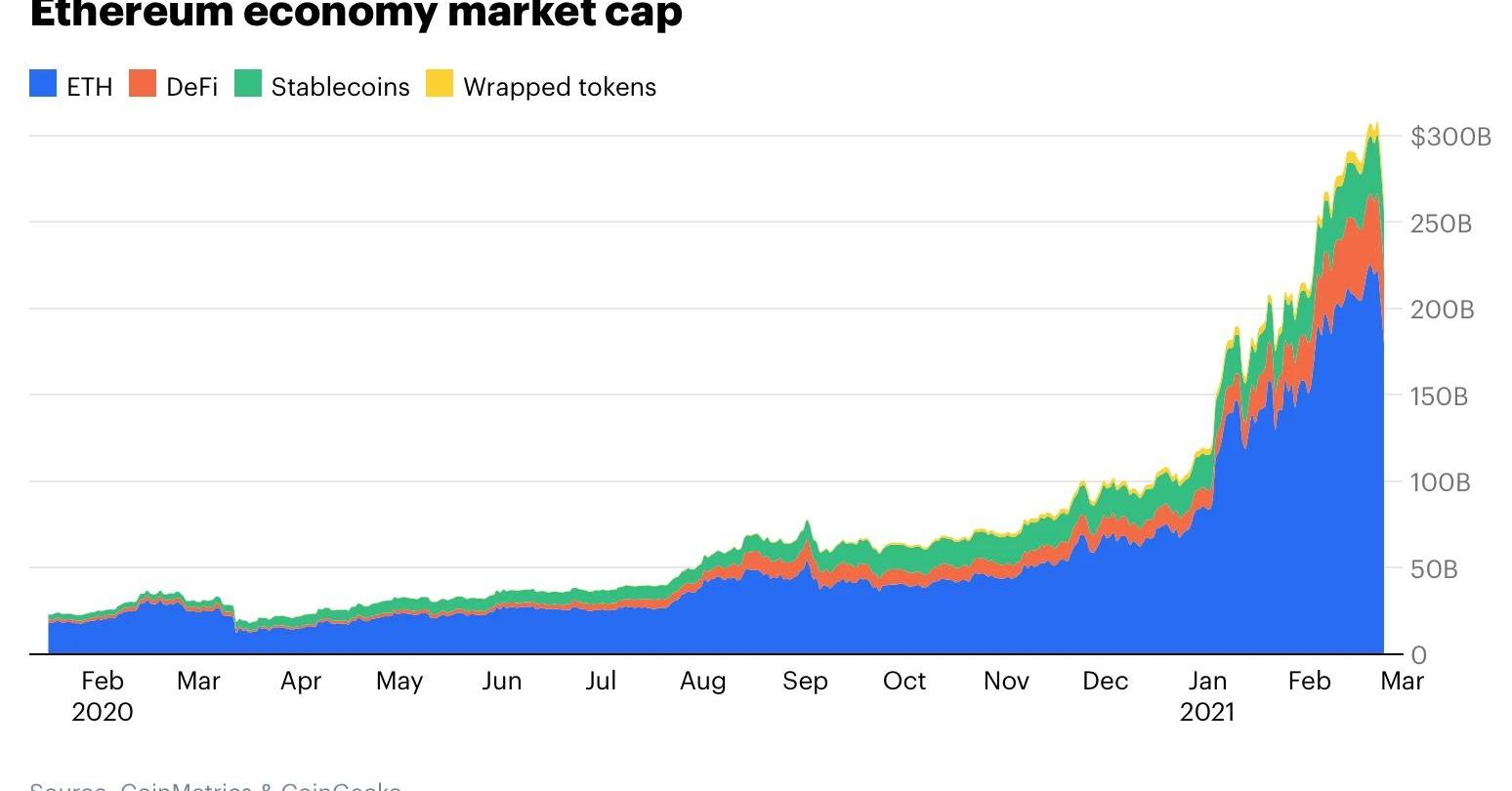 但飆升的市值只是以太坊故事的一部分。以太坊真正吸引人的地方在于,以太坊區塊鏈使更廣泛的經濟成為可能。我們可以把ETH的價格想象成冰山一角。由于以太坊區塊鏈非常靈活,大量的經濟活動正在以太坊區塊鏈上運行著,基于以太坊的加密貨幣類別包括了DeFi、穩定幣、wrappedtoken和NFTs。以太坊經濟的市值在最近幾周飆升至超過2500億美元,這其中還不包括NFT。