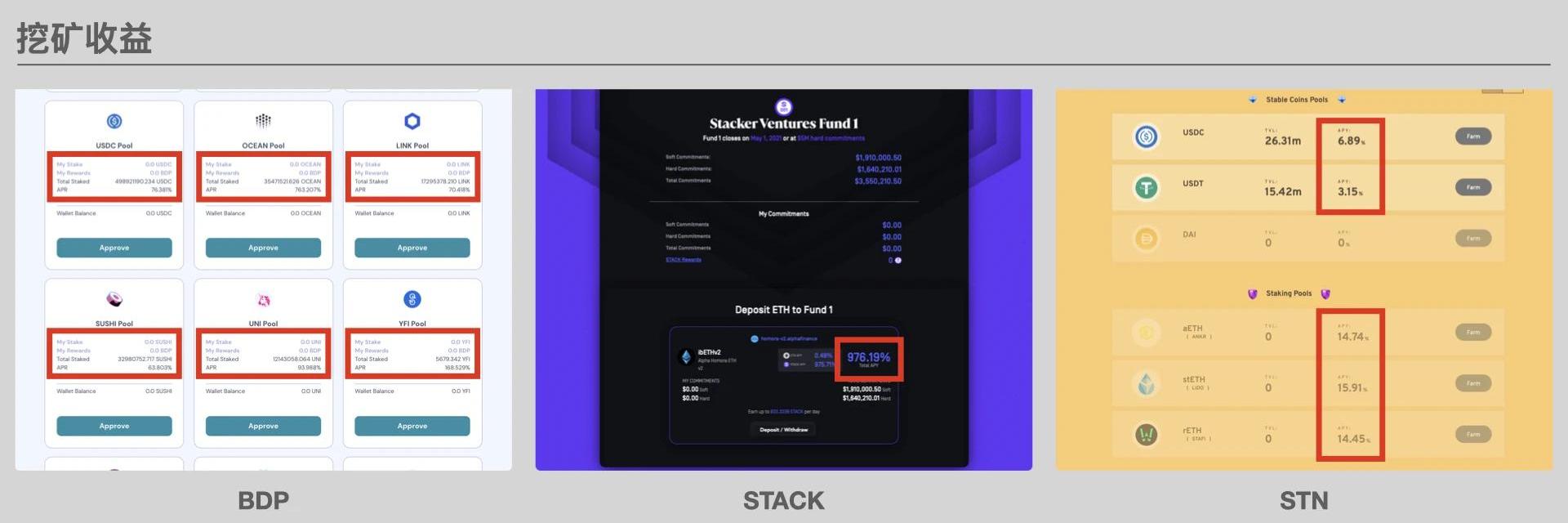 從當下全球投資市場來看,無論是黃金、股票、債券,各種資產的投資收益對比來看,加密貨幣無疑是不可忽視,甚至可以說是第一梯隊的資產選擇了。BTC過去10年,已造就出無數的新貴。“快、準、猛”一向是這個圈子FOMO的必備姿勢了。只要選對了標的,第一波進場的群眾,肯定能比第二波多賺1~3倍,就拿BTC挖礦來說,創世礦工、第一個牛市的礦工、第二個牛市的礦工,他們的收益至少差個10倍甚至更多。DeFi興起以來,新礦層出不窮,但畢竟投資者資金有限,面對市面上那么多挖礦的機會,怎么選擇機會大、風險小的“富礦”呢?原則只有一個:看得準、進場早。筆者今天就以三月至今的三大新礦BDP、STACK、STN,分別是BigDataProtocol、StackerVentures、Stone的平臺幣,來對比一下,讓礦工挖的明白。由于交易對的流動性挖礦是有潛在損失風險的,本文把重心放在無損的鎖倉挖礦上。下面,我們就從挖礦收益、幣價走勢、項目官網、投資方陣容四個維度來對比下。