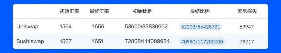 圖1:Uniswap和SushiswapETH-USDT交易對界面Uniswap和Sushiswap的ETH-USDT交易對界面展示了目前池中的代幣匯率、數量、總價值和手續費的價值。因此我們可以根據代幣的目前數量和匯率變化計算出代幣的初始比例以及承受的無常損失,計算時考慮了池中手續費的注入。