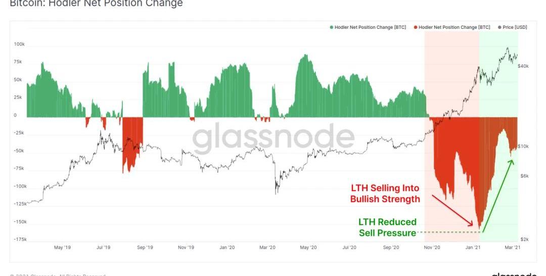 供應調整后的CDD實時圖上圖顯示,從2020年10月到2021年1月8日期間,LTHs確實開始了賣出的行為。然而,自1月8日以來,LTHs已經放緩了這種行為。CDD的7日和30日移動平均線都回到了高位,但對于牛市初期甚至熊市來說并不罕見。這一指標表明,與礦工類似,LTLHs也在獲利,但肯定不是急于出逃。為了進一步增加這一論點的分量,我們可以看看這些LTHs的凈余額。我們看到了一個與礦商幾乎相同的模式,即從2020年底到2021年1月初出現了拋售高峰,然后急劇放緩。從凈值上看,LTHs仍然以每天約4.45萬BTC的速度進行分配,然而這只占期貨市場每日交易量的不到5%,而且趨勢是減少支出。