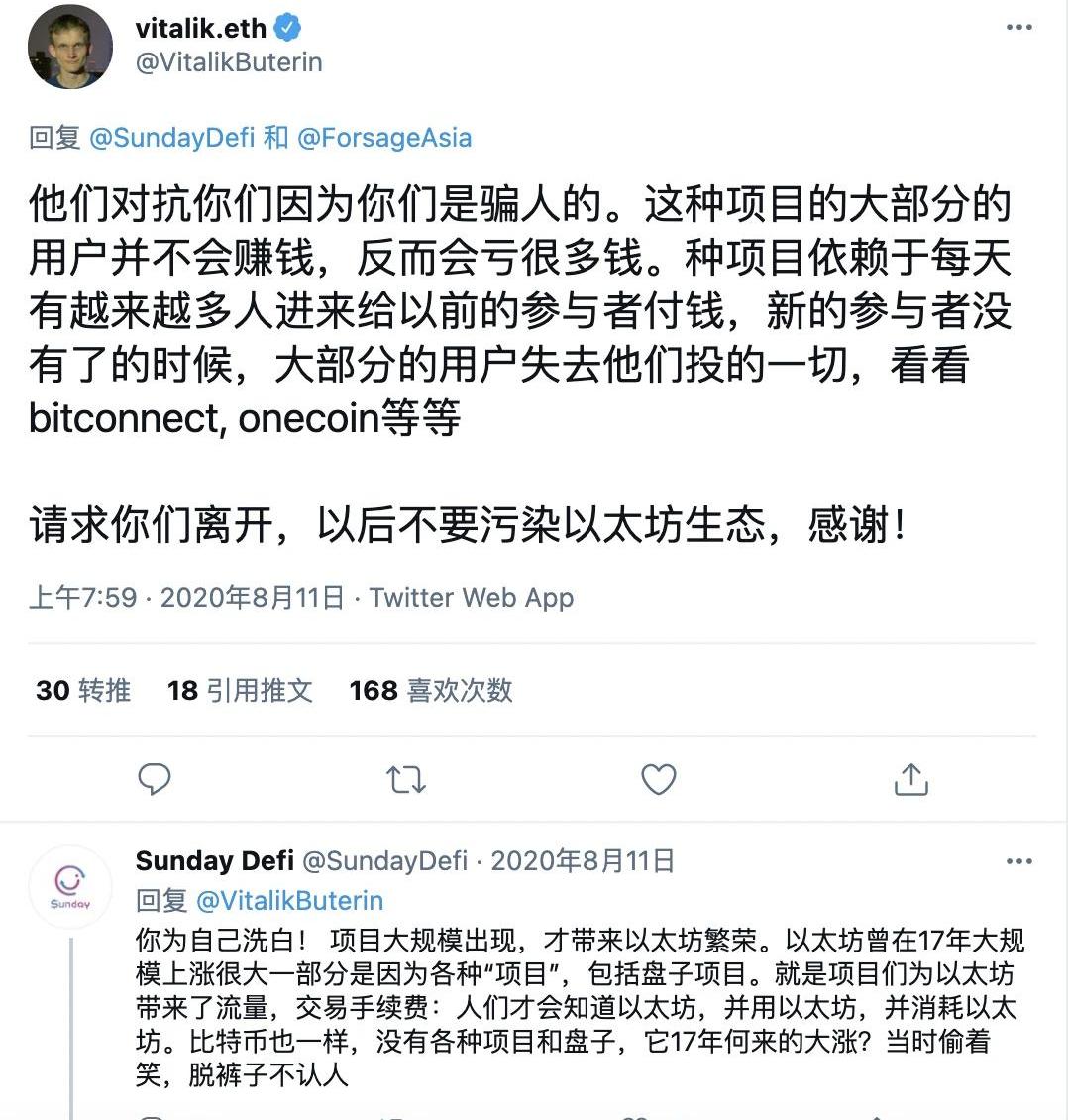 天底下沒有新鮮事,曾幾何時,以太坊同樣因為騙局頻出備受指責。龐氏騙局、資金盤、ICO騙局、空氣幣……曾出不窮。甚至到了2020年年中,Blockstream首席執行官AdamBack依然在推特上炮轟以太坊,稱其為龐氏騙局。就連以太坊創始人V神也時不時為以太坊上的龐氏騙局所困擾。2020年,V神在推特上公開指責龐氏騙局項目Forsage污染以太坊生態,請求他們離開,卻又對他們無可奈何。