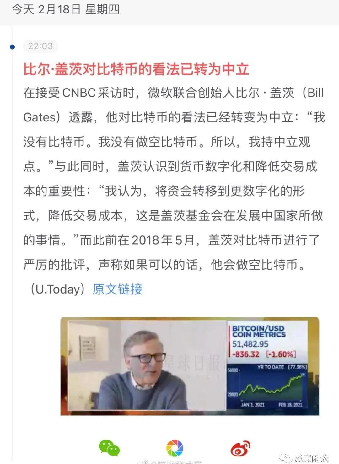 比爾蓋茨本人當然作為首富影響很大,但是影響更大的是他對比特幣的觀念會對微軟這個美股巨無霸企業的決策造成很重要的影響。眾所周知,我們對下一個買入比特幣的科技公司最大的指望是蘋果,其次就是亞馬遜和微軟。不管是哪個,對于比特幣來講都是巨大的盛宴。而現在微軟的靈魂人物對比特幣改觀了,而且是公開說了,那么這一切就值得玩味了。起碼,他們可以開始考慮考慮了吧?我希望未來十年,我能看到前十大科技公司都擁抱比特幣,能看到比特幣真正接近黃金的市值。最后分享個昨天的趣事兒: