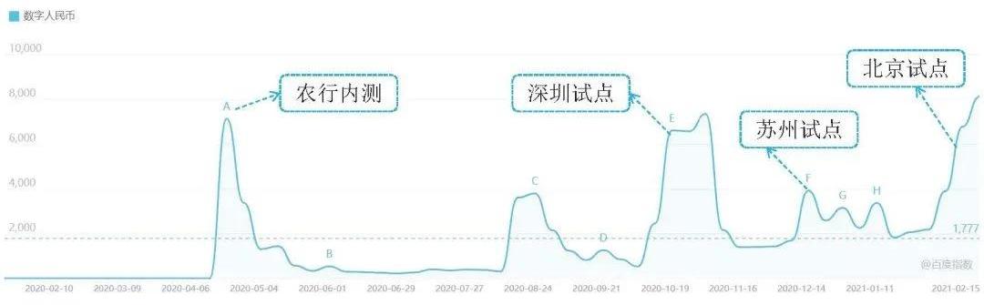 圖源:中國人民銀行,人民日報自深圳羅湖拉開數字人民幣紅包試點的序幕以來,數字人民幣的版圖正在不斷擴張。目前深圳已進行3輪數字人民幣紅包試點,蘇州也已進行2輪,北京在2021年2月也成功推進了數字人民幣更多試點應用,預計未來也將出現多輪試點活動。雄安、成都、上海等地雖然還未開始大規模試點,但也在積極布局,在局部地區和部分業務場景中開始測試數字人民幣。而通過多輪試點,公眾對于數字人民幣的關注程度更高,理解也愈發深入。圖3“數字人民幣”百度搜索指數變化