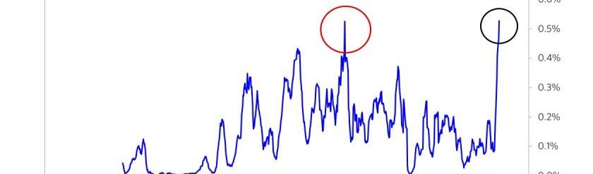 各個股票的讀數有很大差距。按照這些標準,一些股票正處于極端的泡沫之中,而一些股票則沒有泡沫。下表為指標顯示正處于泡沫之中的美國公司的比例。在美股排名前1000的公司當中,這一比例為5%,大約為科網泡沫頂峰時期的一半。標普500指數公司的泡沫比例則要小一些,因為幾家泡沫最嚴重的公司都不屬于該指數。
