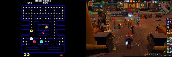 幾乎所有早期的視頻游戲都以相同的收入模式開始。用戶為玩游戲而付費。第一批游戲,如《吃豆人》(左),允許玩家玩一兩輪,然后再要求更多付款。后來發展到個人電腦上的游戲,如《使命召喚》或《魔獸世界》(右),則出售永久許可證或經常性訂閱。雖然交易很簡單,但用戶并沒有什么影響力。最明顯的改進是以內容擴展包的形式提供更多的游戲時間。