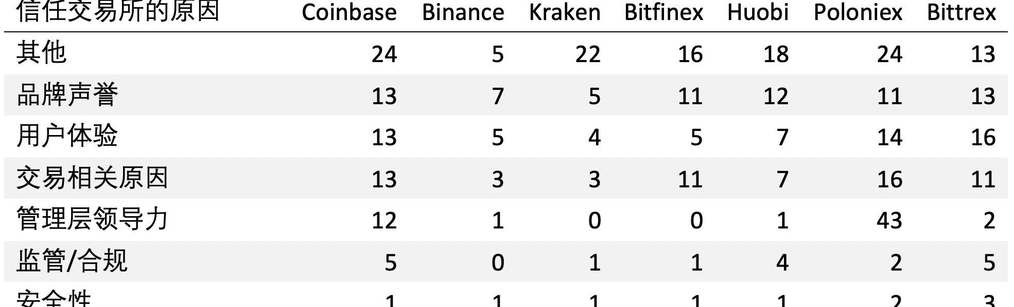 具體原因數量受訪者答復數量本身,因為某些原因屬于上述的多個類別;例如,受訪者可同時表明交易相關原因和管理層領導力是他們偏愛特定交易所的原因。總體而言,品牌聲譽在決定受訪者是否信任特定交易所中產生了最大的影響。安全性和合規性也是構建構成了受訪者信心的原因。其他更多使用方面的原因,包括用戶體驗和交易原因雖然也很重要,但是他們的重要性無法企及合規性因素和良好的品牌聲譽。中心化交易所表1