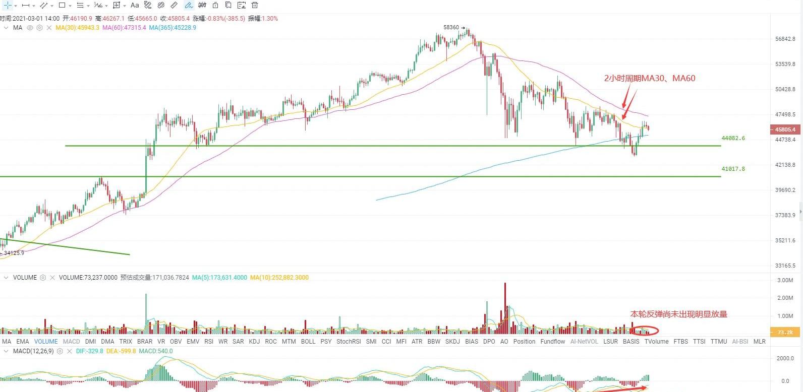 消息面:當地時間2月27日凌晨,美國眾議院如期通過1.9萬億美元的經濟刺激計劃,即便沒有一個共和黨意愿投票支持。其中包括直接向符合條件的美國人支付1400美元的補助金,為符合條件的失業者提供每周400美元的失業救濟金,簡直就是直接撒錢。雖然“大水”如期而至,但市場早已提前消化了預期,所以在正式實施后資本市場反應并不明顯。據最新數據顯示,美國10年期國債收益率持續回落,已經從上周最高點1.61%回落至目前的1.4%,其中今日下跌3.62%,近期擾動市場的重要因素“通脹”預期有所降溫。今日亞太股市、比特幣市場的反彈行情與此有較大關系。二級市場:上周五比特幣在小幅創出新低后在量價和MACD的雙重底背離的狀態下引發了一波小幅反彈行情,反彈延續性有限,僅僅維持兩天便再次創出調整以來新低。不過在新低之后底背離形態再次出現,反彈再一次如期出現,目前幣價于反彈高位區窄幅盤整運行。從成交量看,本輪反彈和前幾次一樣沒有出現明顯放大跡象,同時MACD指標雙線也尚未脫離零軸下方區域。MACD零軸一般作為所參考周期圖走勢的強弱分水嶺,所以后市要重點關注MACD雙線突破零軸與否。除了MACD指標外,代表市場平均成本的指標MA30和MA60組合目前還呈現空頭排列格局,這都是多頭短期需要注意的風險點。歐易OKExETH/USDT永續合約: