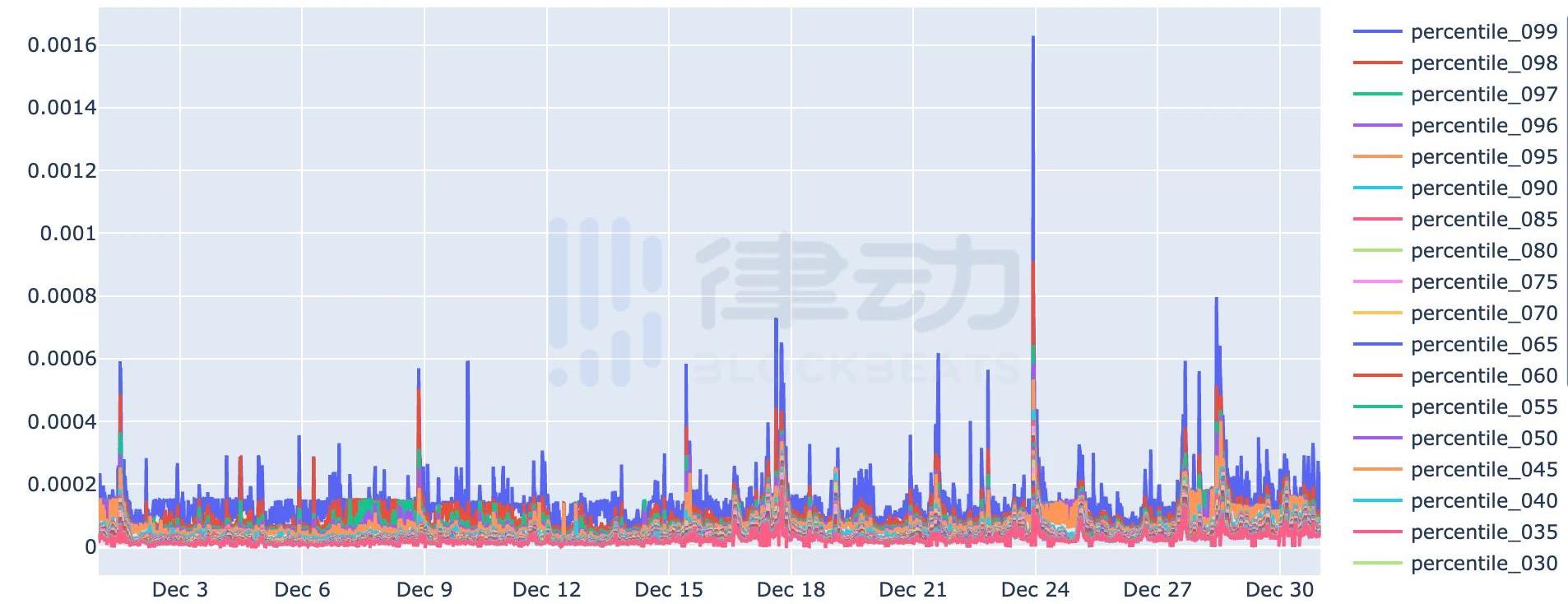 以太坊區塊Gas價格的百分位數,單位為美元/Gas這里我們看到12月份按百分位數計算的美元/Gas交易價格。最低的百分比會有波動,但保持在0.00-0.0002美元的范圍內。在極端的情況下,我們看到最高的百分比在某些日子的某些時間飆升,比一般DeFi用戶支付的價格高出幾個數量級。這些離群值是清算人為他們的交易分配了大量的Gas,以使他們的清算交易通過的幾率最大化。在某種程度上,我們可以用模擬清算拍賣的方式來模擬先到先得的清算,其中代理人使用Gas而不是拍賣機制進行競價。這里最大的區別是,先到先得拍賣有其清算折扣的上限,由于清算人被迫出價更多的Gas來贏得拍賣,推動了真實收益的降低。由于在先到先得清算中,即使你支付了最高的Gas,也不能保證贏得清算,所以清算人必須將PnL計算修改為競爭性PnL(cPnL),可以得出: