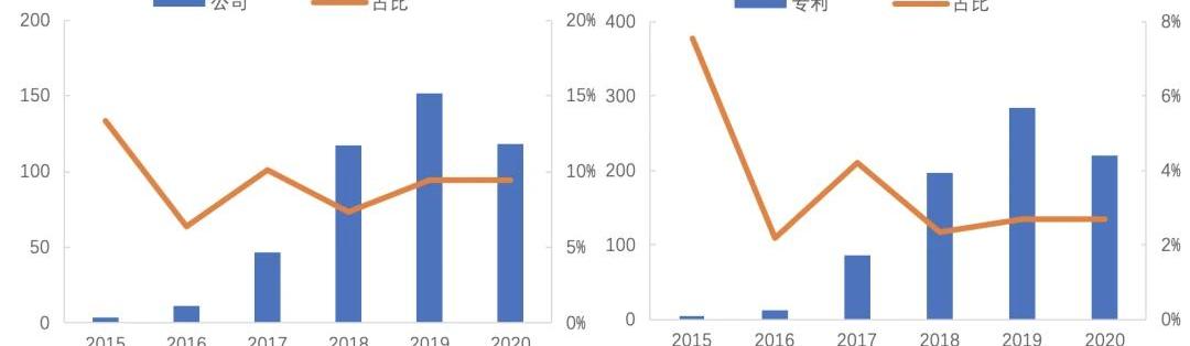 數據來源:零壹智庫從近2年專利申請情況來看,交通物流出現小幅度下滑情況。在2019年,申請該類型專利的公司有151家,占申請區塊鏈專利公司總數的9.42%;2020年,申請該類型專利的公司有118家,占比為9.39%,下滑0.03個百分點。圖14:2015-2020年我國區塊鏈+交通運輸專利申請情況