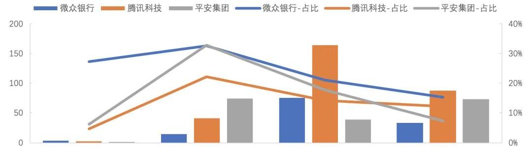數據來源:零壹智庫這種情況也同樣體現在頭部企業當中。以微眾銀行、騰訊科技、平安集團為例。從2018-2020年,所申請的區塊鏈金融專利占比均處于下降趨勢。其中,下降幅度最大的是平安集團。微眾銀行在2020年申請了214件區塊鏈專利,其中區塊鏈金融有33件,占比為15%。而2018年該占比為33%,下降了18個百分點。騰訊科技在2020年申請了721件區塊鏈專利,其中區塊鏈金融有88件,占比為12%。而2018年該占比為22%,下降了10個百分點。平安集團在2020年申請了992件區塊鏈專利,其中區塊鏈金融有73件,占比為7%。而2018年該占比為33%,下降了26個百分點。圖8:2017-2020年微眾銀行、騰訊科技和平安集團區塊鏈金融專利申請情況