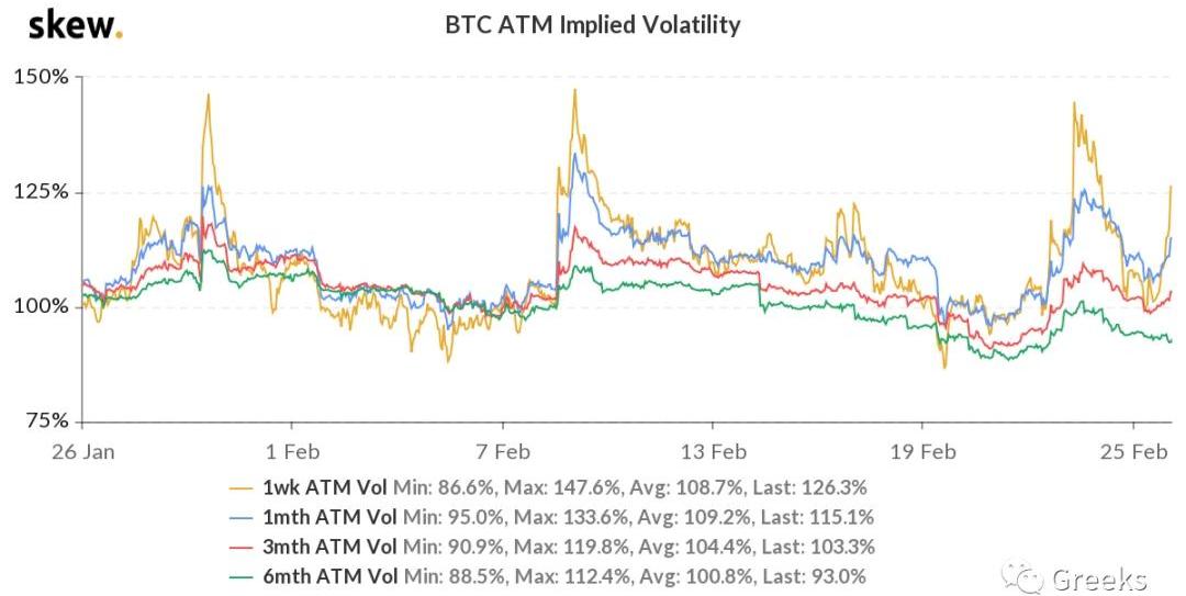 XRP/HKD-0.12%今天是二月的交割日,二月的比特幣漲幅接近50%,以太坊漲幅較小,僅有不足15%。市場在最后一個交易周迎來了一次暴跌,打破了IV的下降通道,但是很快回落至平均水平,趨勢仍然是下降趨勢。一般而言,交割日不會有太大的行情,但是一旦出現行情,就是大行情。期權交易者今天需要通過期貨對沖風險和收益。播報數據由Greeks.live和Skew.com提供。BTC歷史波動率10d103%30d106%90d94%1Y88%期權成交量9.4億美元,目前持倉量為110億美元。各標準化期限隱含波動率:今日:1m115%,3m103%,6m92%2/25:1m107%,3m99%,6m93%比特幣再次進入調整,但期貨和現貨成交量不大,不同于22日的暴跌,今天市場平靜很多。目前報收47000美元,除遠期IV仍維持低位,其他各期限IV回升至年內平均水平。