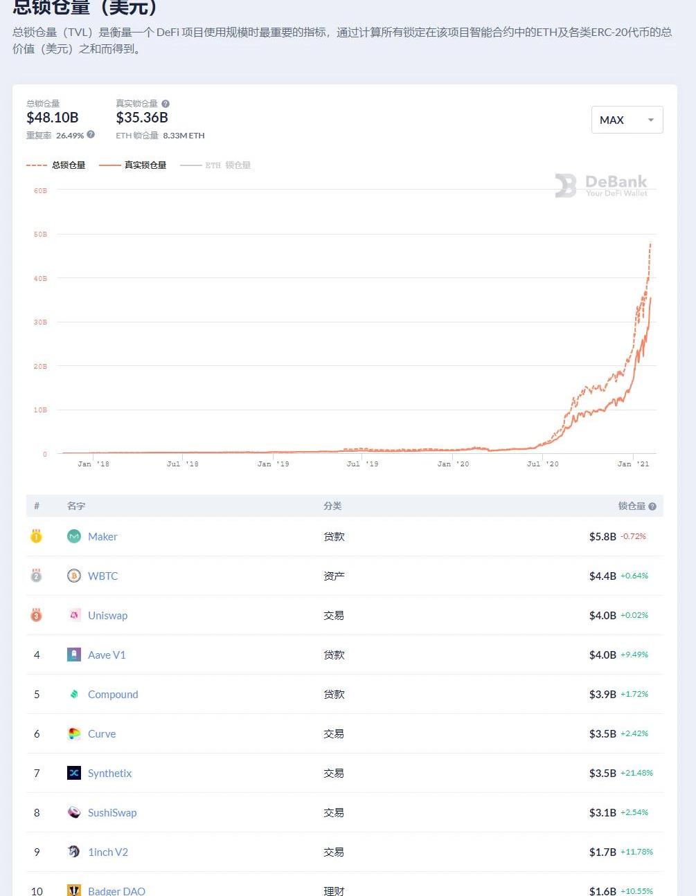 從DeBank上的DeFi鎖倉數據來看,總鎖倉量為353.6億美元,排名前十的絕大多數都是以太坊生態應用,可以看到以太坊幾乎占領了整個DeFi市場。這些數據自今年1月以來獲得了爆發式的增長,從而使得基礎價格提高,在經歷10余次“撿命”之后,逐漸穩定成為人們可信、可持續發展的生態,在其生態上最為著名的DeFi代幣包括YFI,AAVE,COMP,MKR,UNI,SUSHI,GET,CURVE等一眾金融屬性的數字貨幣,還包括WHALE,MEME,DEGO,MANA,SAND等一眾NFT代幣,當然也有很多優質的幣種就不在這里一一列舉了,但在此我們可以看到生態建設的強大性。