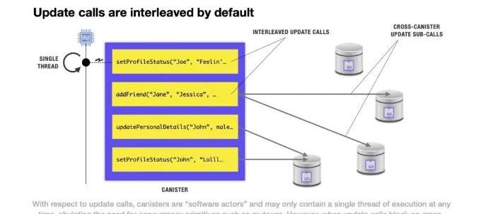 除此,DFINITY對“需要更新容器狀態的更新請求”和“會修改容器狀態的查詢請求”進行了區分。后者不會對內存進行永久更改。這樣一來,在任何給定時間,容器內可以有任意數量的并發線程來處理查詢調用。這些查詢調用針對最后確定的狀態根中記錄的內存快照運行。當進行跨容器更新調用時,如果該調用發生阻塞,DFINITY會允許將執行線程移至新的更新調用。