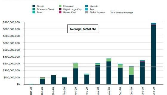 2020年第四季度,不包括灰度比特幣信托的灰度產品需求增長至4.364億美元,環比增長35%,比2019年第四季度增長近1300%。增長的主要原因是對灰度以太坊信托的持續流入,使灰度產品的流入達到10億美元。