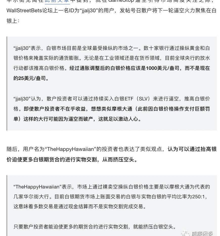 隨后比特幣價格有一定幅度的上升吧,但是顯然,力度已經小了很多了。比特幣現在的市場規模和體量,的確已經不是某個人某個組織能夠直接撼動的。還是接著聊聊經過了一個周末的修整,美股沖鋒軍們昨天又沖鋒了啥吧。首先是之前的那幾個熱門股票,好像表現都已經一般了,沒啥好說的。其實在上周,大家已經看到了美國散戶們把目光盯上上了白銀,起因是這樣的: