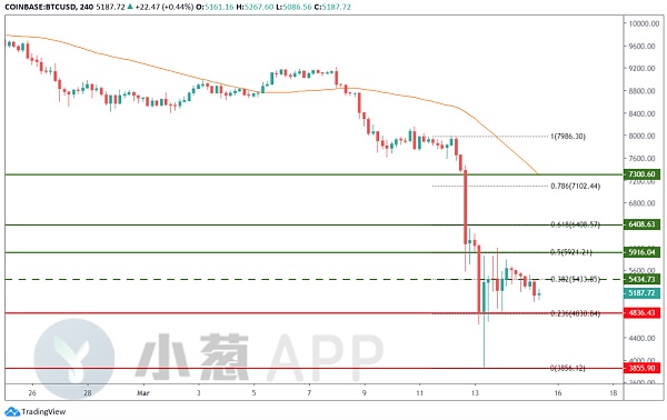 BTC在過去7根4小時K線過程中收出5根陰線,除當前尚未完成收線的一根以外,僅存的一根小陽線出現在行情重新跌至最近一輪深度回調的反抽0.382黃金分割支撐線之后,而且并未能夠幫助行情完成對于這一重要技術參考的重新收復,價格在短暫回探5435這一關鍵點位后再度受挫回落,并且很快走出了一根長陰線重新迫近5100整數位置。