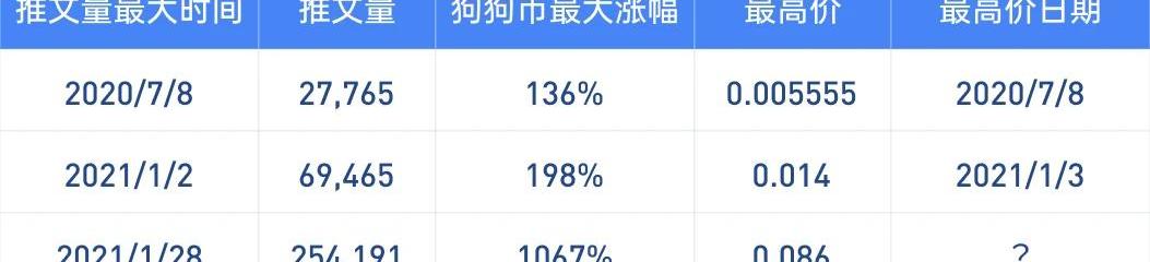 從圖表中我們發現一件有趣的事情,狗狗幣推文量的暴增這不是第一次,2020年6月至今,這一現象出現了3次,而且每次有關狗狗幣的推文暴增時,狗狗幣的價格都出現了大幅拉升。前有川普Tiwtter治國,現有“狗莊”Tiwtter拉盤?下圖我們詳細滲透一下狗狗幣推文與最高價的因果關系。更多狗狗幣數據,就上KingData查看。https://ikingdata.com/#/home