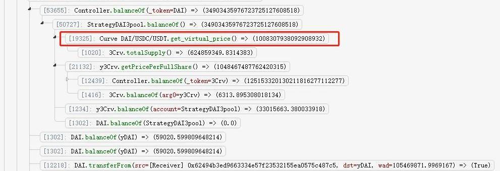 △圖4不斷進行上述循環,這使得攻擊者消耗DAI進而獲取Curve代幣。經過多次循環之后,攻擊者套取了大量的Curve代幣,而將DAI代幣打入了Curve合約中。在整個攻擊流程結束時,攻擊者使用Curve代幣,兌換出DAI/USDC。這次兌換,因為不是USDT的兌換,即使此時的DAI相對攻擊前含量較高,也會按照同等比例進行兌換,也就是攻擊者打入Curve池子中多出的DAI代幣,也會分發給攻擊者。這里,我們再來看攻擊者在進行攻擊時的第一步操作,如下圖所示: