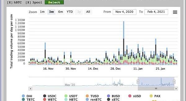 每個交易對如果本位幣,是穩定幣,該交易對的信任程度更高,因為對投資者更友好,上圖為Curve展示的穩定幣交易的占比,其中DAI和USDC遙遙領先,這得益于maker和circle的努力,另外,每個defi,只要有dai和usdc交易對就可能得到更高的鎖倉量。