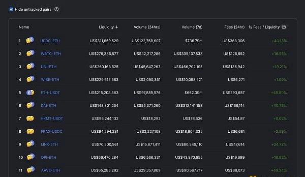 此外,通過查看uniswap上的交易對交易量排名,也可以發現端倪。足以看到重要代幣的交易對的重要性。