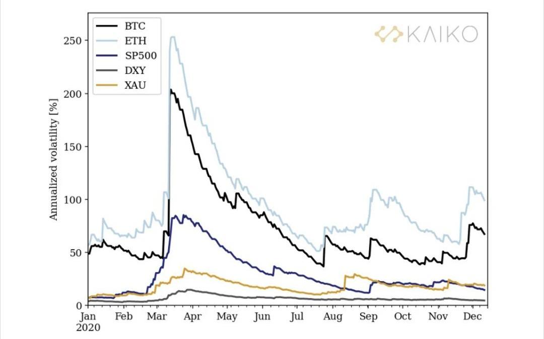 圖1:BTC和其他資產之間的相關性3月12日,在因COVID-19大流行而傳播的市場暴跌之后,相關性出現了突然的上升。雖然不久后DXY(美元指數)出現逆轉,但標普500指數和BTC之間的巨大相關性在很長一段時間內持續存在。直到最近,隨著越來越多的投資者宣布大量配置數字資產,BTC正以前所未有的價格快速上升,這種相關性才開始減弱。從歷史上看,今年ETH與BTC的相關性很高,尤其是在3月至8月期間。從夏季開始,這兩種資產之間的相關性波動很可能是對DeFi熱潮以及與以太坊2.0過渡相關的激烈活動和不確定性的回應。在12月1日推出BeaconChain之前的幾周,ETH和BTC之間的相關性在11月24日達到最低點0.14。接下來,在圖2上對比相同資產的歷史波動率。可以看出,雖然自3月市場暴跌以來波動率有所下降,但標普500指數的波動率仍高于1月和2月的水平。