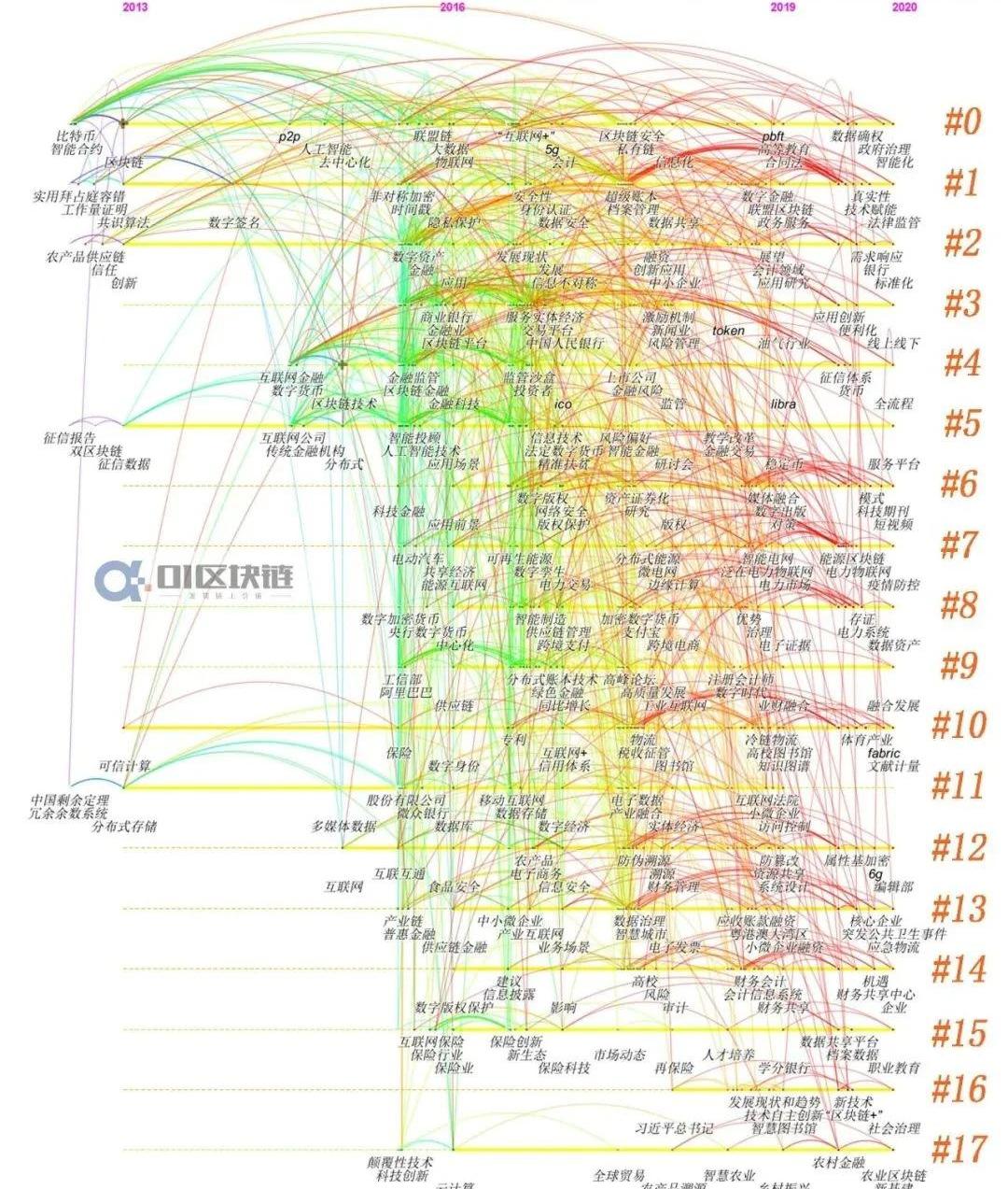 資料來源:01區塊鏈根據文章分析情況整理綜合2013-2020年研究分支和研究熱點的逐年變化,不難發現:學界對區塊鏈的研究從虛擬貨幣開始,逐步拓展到傳統金融行業,并延伸到社會生活的多個方面,同時區塊鏈的技術架構、與其他技術的結合方案等也都在研究層面有了長足進展。整體來看,學界研究一直緊跟產業界的發展,并能夠對時事熱點做出及時反應,推動區塊鏈技術的更新迭代,使其真正發揮價值。2.研究領域不斷拓展,整體知識網絡初步形成對于一門學科來說,構建系統的知識網絡是十分重要的。為了更好地體現區塊鏈研究的熱點動向及演進,我們將2013-2020年的區塊鏈相關文章進行聚類分析,并用整體關鍵詞聚類網絡和時間線聚類來闡釋區塊鏈研究的發展全景圖。在區塊鏈的相關研究中,經過了2013-2020年的發展,一個初步的知識體系在不斷形成、完善、拓展。圖3-5是綜合2013-2020年的文章繪制的關鍵詞聚類網絡,利用CiteSpace的逐年標記方法,將每一個年份涉及到的關鍵詞網絡用不同的顏色表示,反映在整體的網絡中每年研究內容的覆蓋和聯絡情況。對比2013-2020年各年研究內容在整體關鍵詞聚類網絡中的覆蓋情況可以看出,2013年和2014年的研究較為零散,小范圍內形成了針對比特幣和虛擬貨幣的研究網絡,對于區塊鏈的基本技術情況也有所提及,但并不系統;2015年和2016年,對于區塊鏈的探索將區塊鏈技術本身與金融、虛擬貨幣經濟聯系在一起;到2017-2018年,已基本形成完整的區塊鏈研究網絡;2019-2020年在此前基礎上進一步向外拓展了許多研究領域,同時內部網絡線條密度更大,體現出原有網絡中各研究領域的聯系更加緊密。圖3-5:區塊鏈整體研究網絡覆蓋圖