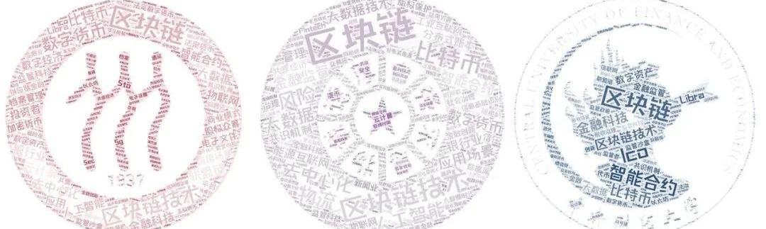 圖源:中國知網本文選取較為活躍的3個高校——人大、清華、中財進行進一步分析。我們對三個高校在區塊鏈領域所發文章的關鍵詞進行了初步統計,形成了如下的三個詞云圖,可以看出,不同機構的研究各有側重。為了更好地體現各個機構的研究情況,我們利用關鍵詞網絡、作者合作網絡、時間線聚類進行深入探究,重點在于發掘各個機構的研究重點與領軍人物,希望能夠為機構間的合作交流提供較好的參考。圖3-8:人大、清華、中財在區塊鏈相關文章的關鍵詞詞云圖