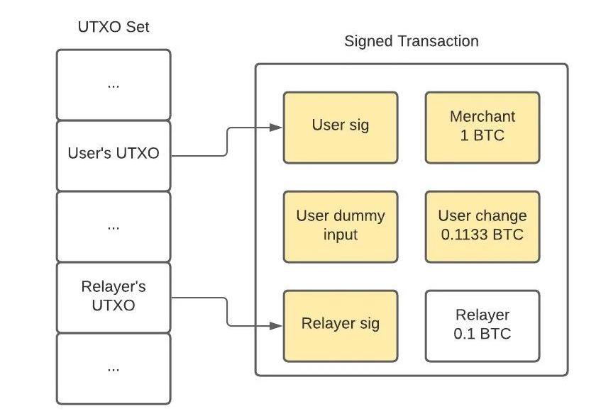 這對以太坊來說很容易,但對比特幣來說就不那么容易了。中繼器支付網絡費用的普遍說法是為用戶解決協議(或托管)問題。關鍵的例子是支持“減少gas”的ERC20轉賬,因為用戶可能沒有足夠的ETH來支付網絡費用,但他們可以通過ERC20代幣退款給中繼器。然而,同樣的用例也存在于比特幣上的Tether,盡管還沒有為它進化出一個生態系統。我們猜測只要能從服務中得到收益,中繼器就會為用戶支付網絡費用。比如比特幣保險庫。用戶支付管理員來監控他們的保險庫,如果檢測到惡意行為,就會發出取消交易的命令。用戶向管理員支付訂閱費,作為回報,管理員承諾支付任何必要的費用來保護保險庫。此外,為了簡化過程,使用中繼器的資金來支付網絡費用可能是可行的(例如,以一種特別的方式附加多個費用輸出,從而從根本上提高費用)。下面,讓我們花一些時間來回顧一些關于比特幣交易的背景信息。比特幣交易(UTXO)背景