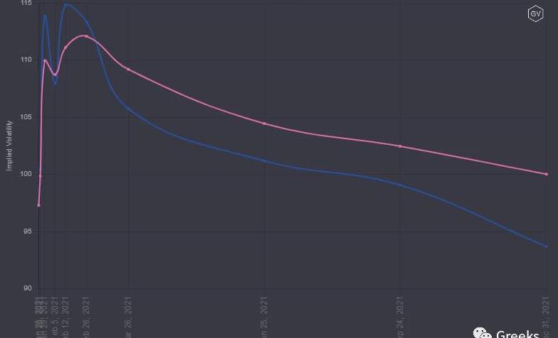 BTC歷史波動率10d99%30d96%90d78%1Y84%期權成交量1.93億美元,目前持倉量為71億美元。周末成交量很低,目前看來比特幣的走勢確實不及其他幣種。各標準化期限隱含波動率:今日:1m112.8%,3m107.2%,6m103.4%1/24:1m103.7%,3m102.5%,6m101.4%比特幣的各期限IV出現反彈,實際上比特幣的RV一直在下降,而且賣方也要比買方主動,現階段的反彈主要是因為ETH新高帶來的市場情緒高漲。